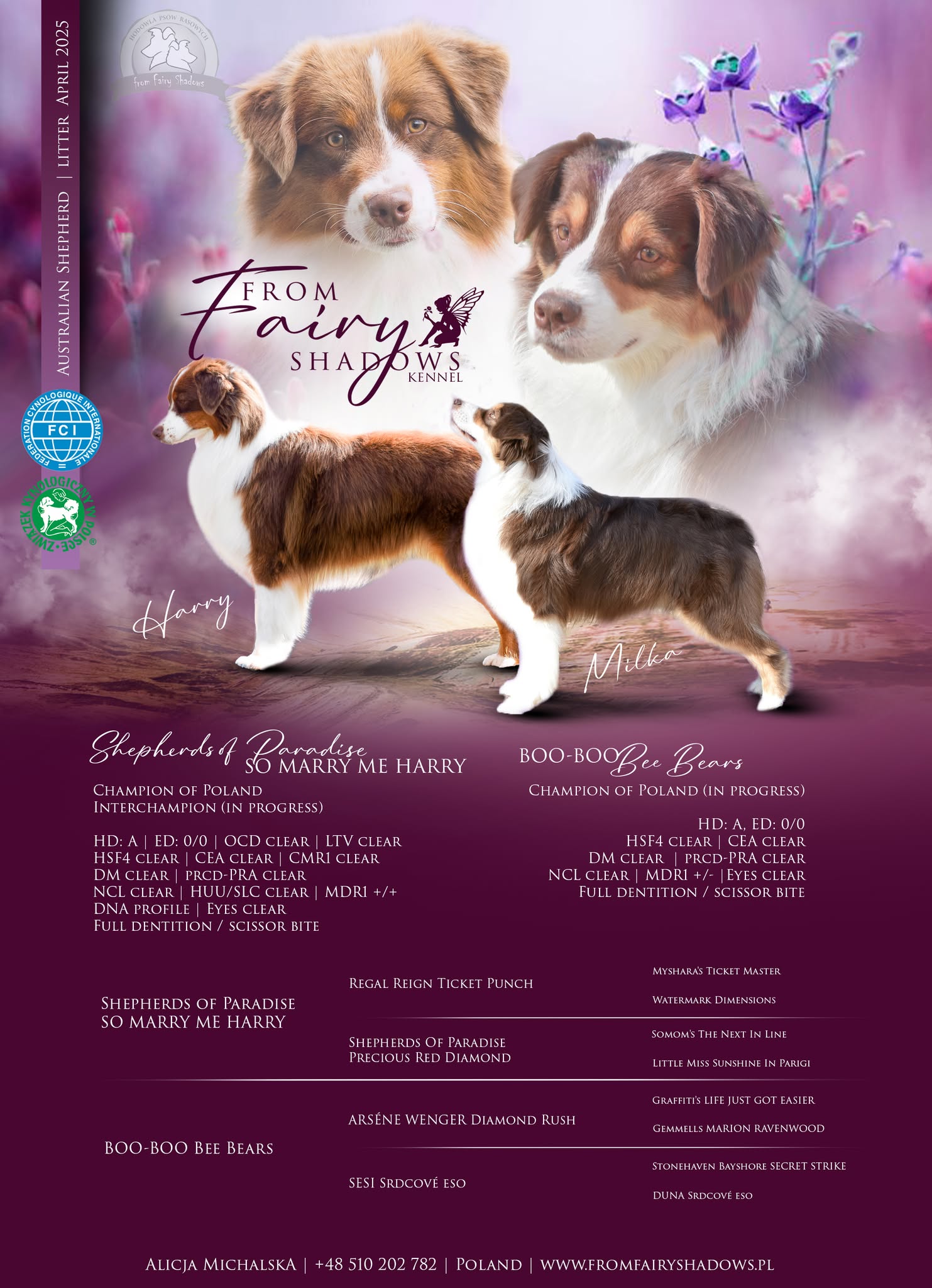 Ojcem szczeniąt po raz pierwszy w naszej hodowli zostanie Harry, pies sprowadzony z Francji z bardzo dobrymi liniami show w rodowodzie. Harry to średniej wielkości pies (52cm), bardzo zrównoważony, bezkonfliktowy, o doskonałej budowie i proporcjach ciała. Uznawany na wystawach przez sędziów również za piękny ruch. To bardzo posłuszny i łatwy w prowadzeniu pies, w stadzie bezkofliktowy. W stosunku do obcych podchodzi z rezerwą w pierwszym kontakcie. W domu to prawdziwy pieszczoch, kochający bliskość człowieka.